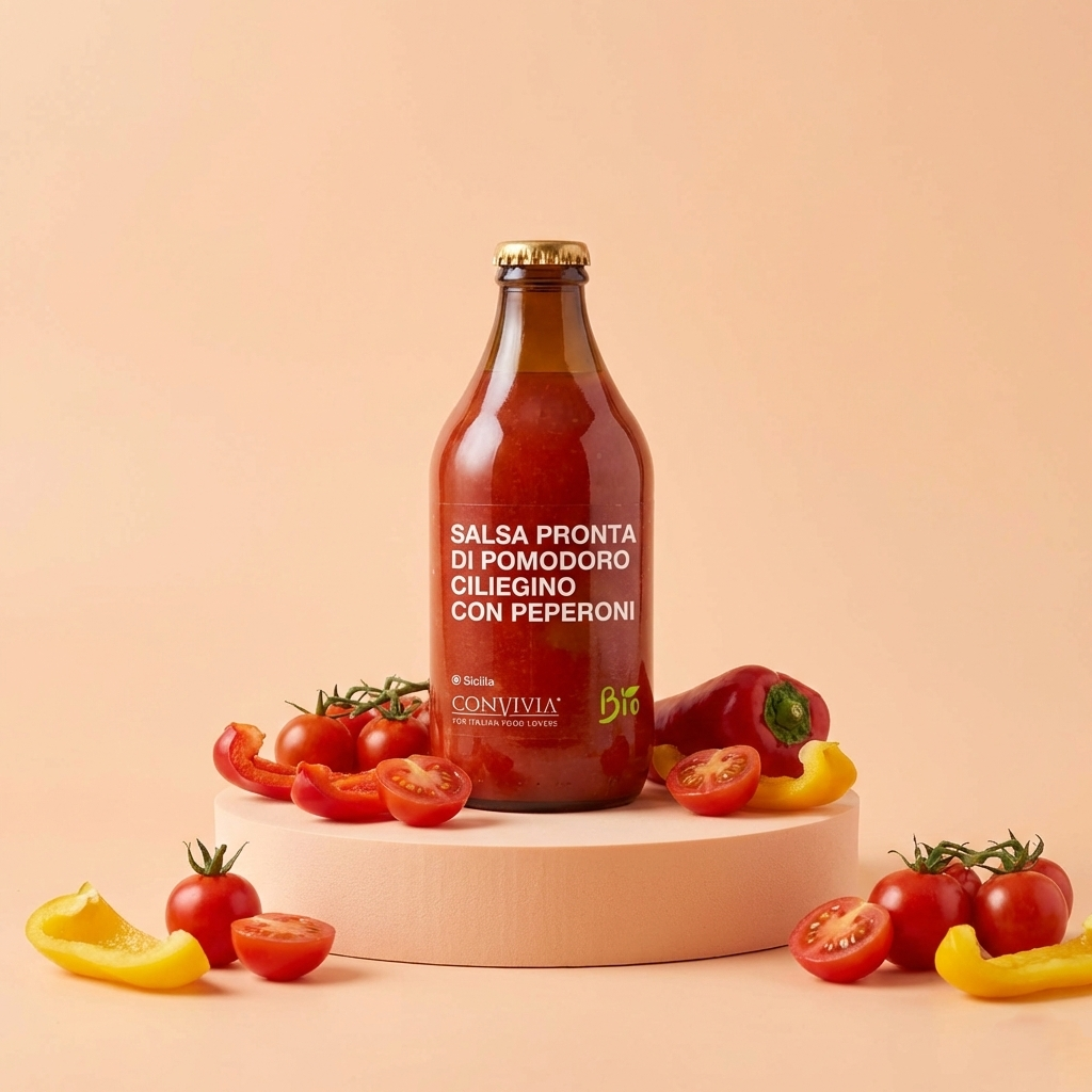 La salsa di pomodoro ciliegino con peperoni biologici è una deliziosa combinazione di pomodori ciliegino biologici maturati al sole e peperoni freschi, accuratamente selezionati.