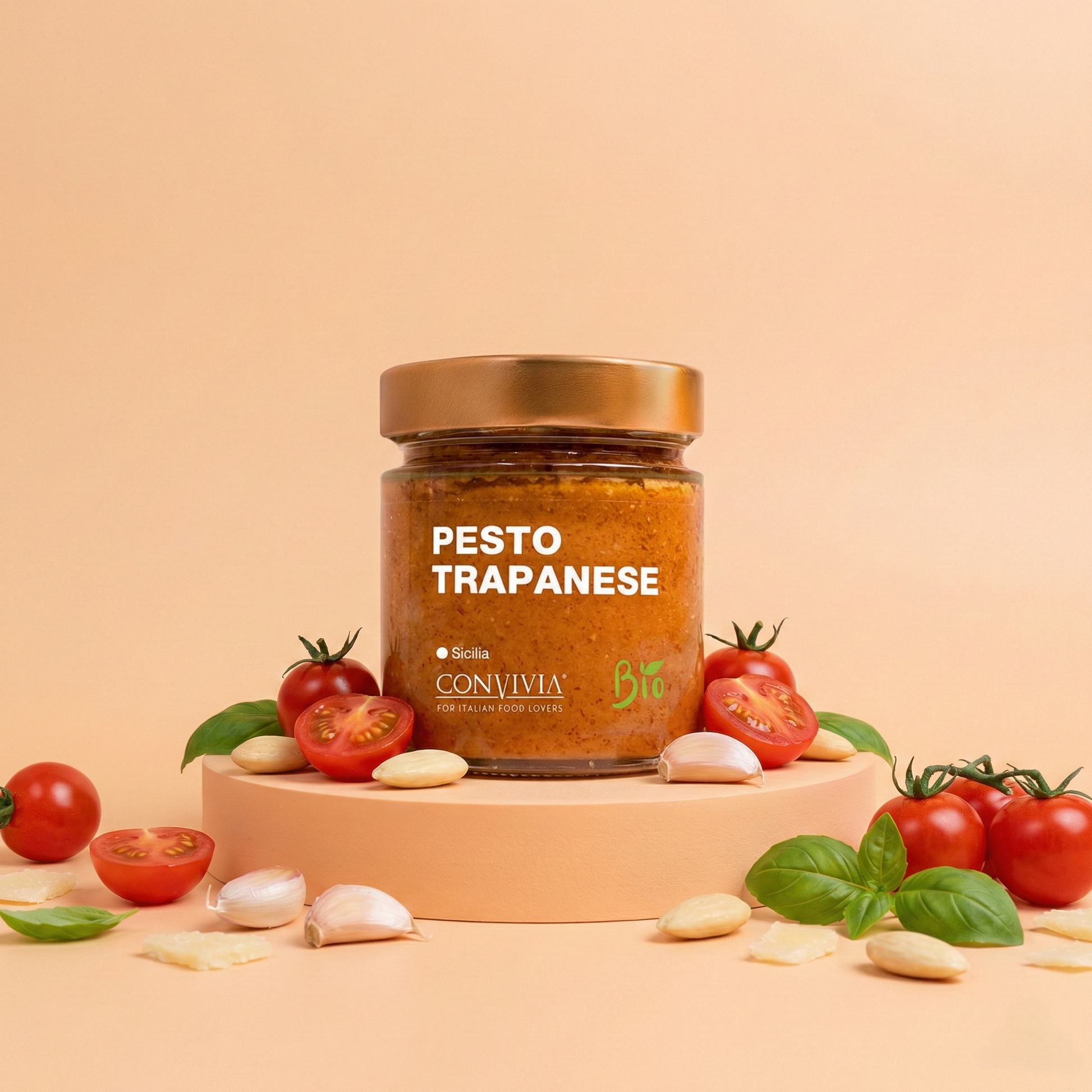 Il Pesto Trapanese Bio è una salsa a base di pomodori secchi, mandorle, basilico fresco e olio extravergine d’oliva, il tutto proveniente da agricoltura biologica certificata.