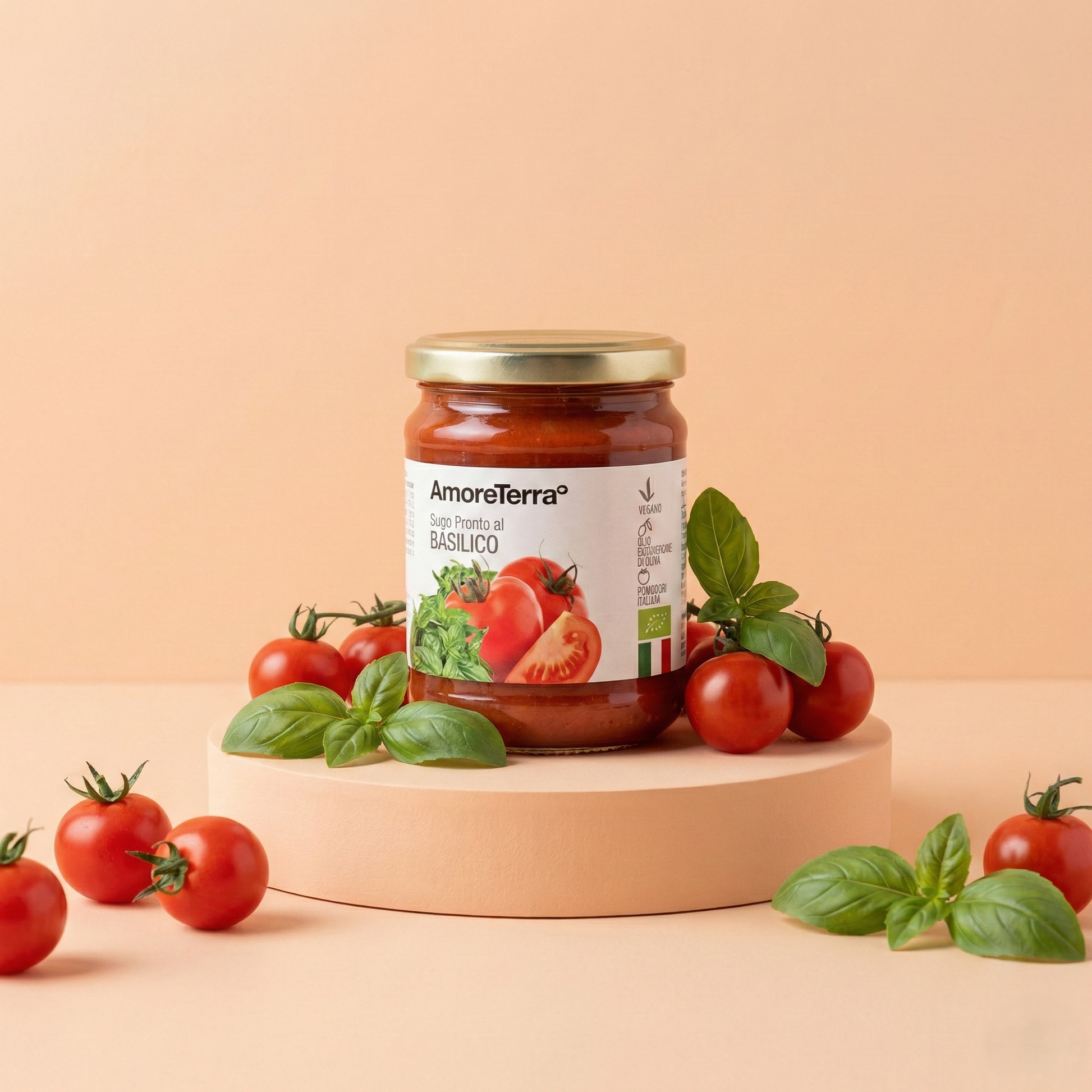 Il sugo pronto al basilico AmoreTerra è un prodotto biologico di alta qualità realizzato con pomodoro coltivato in Puglia, basilico e olio extravergine d'oliva di alta qualità, con l'aggiunta di sedano, carote e cipolle per dare a questo condimento un gusto più ricco.