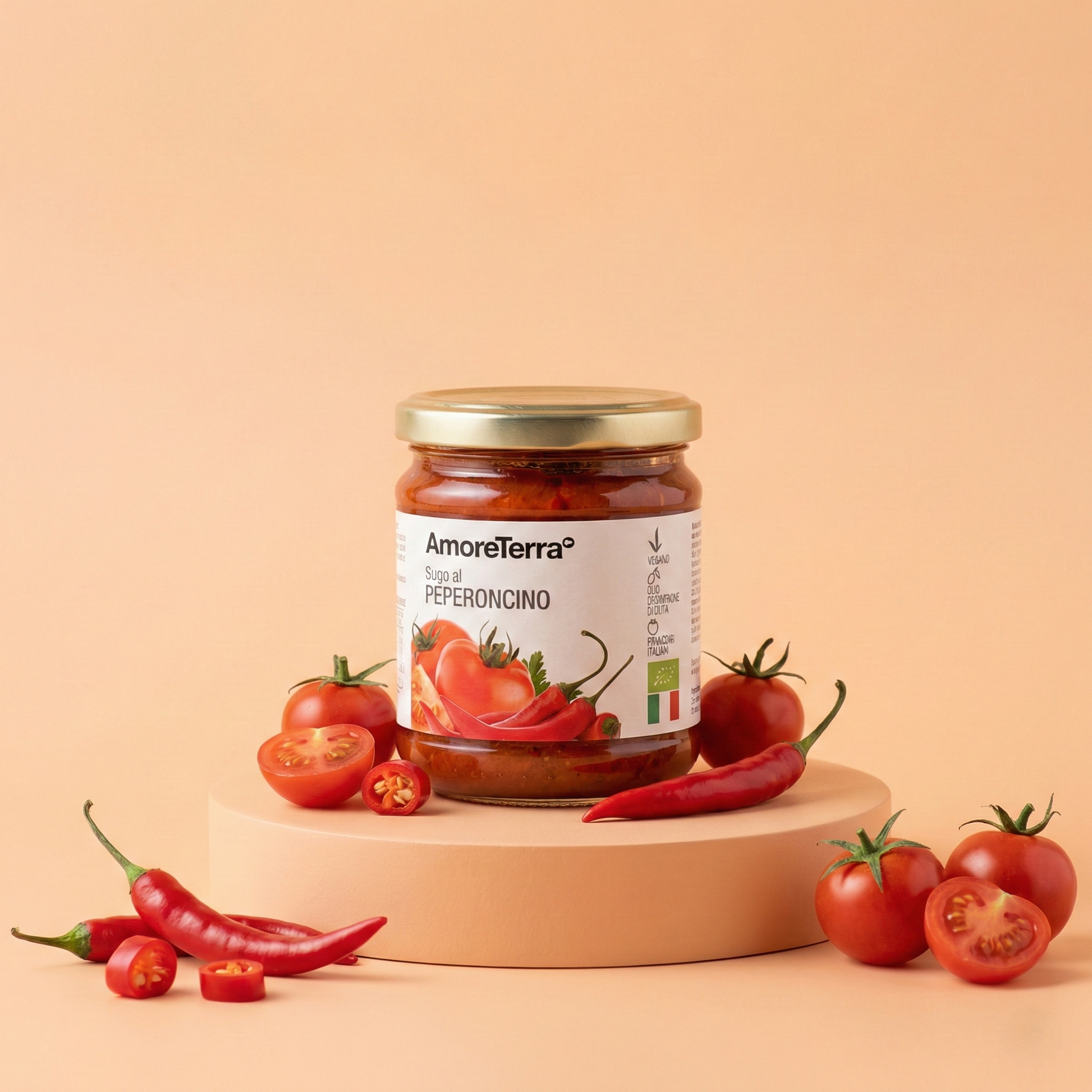 Il sugo pronto al peperoncino AmoreTerra è un prodotto biologico di alta qualità realizzato con pomodoro, olio extravergine d'oliva coratina di alta qualità e peperoncino, con l'aggiunta di sedano, carote e cipolle per dare a questo condimento un gusto più ricco.