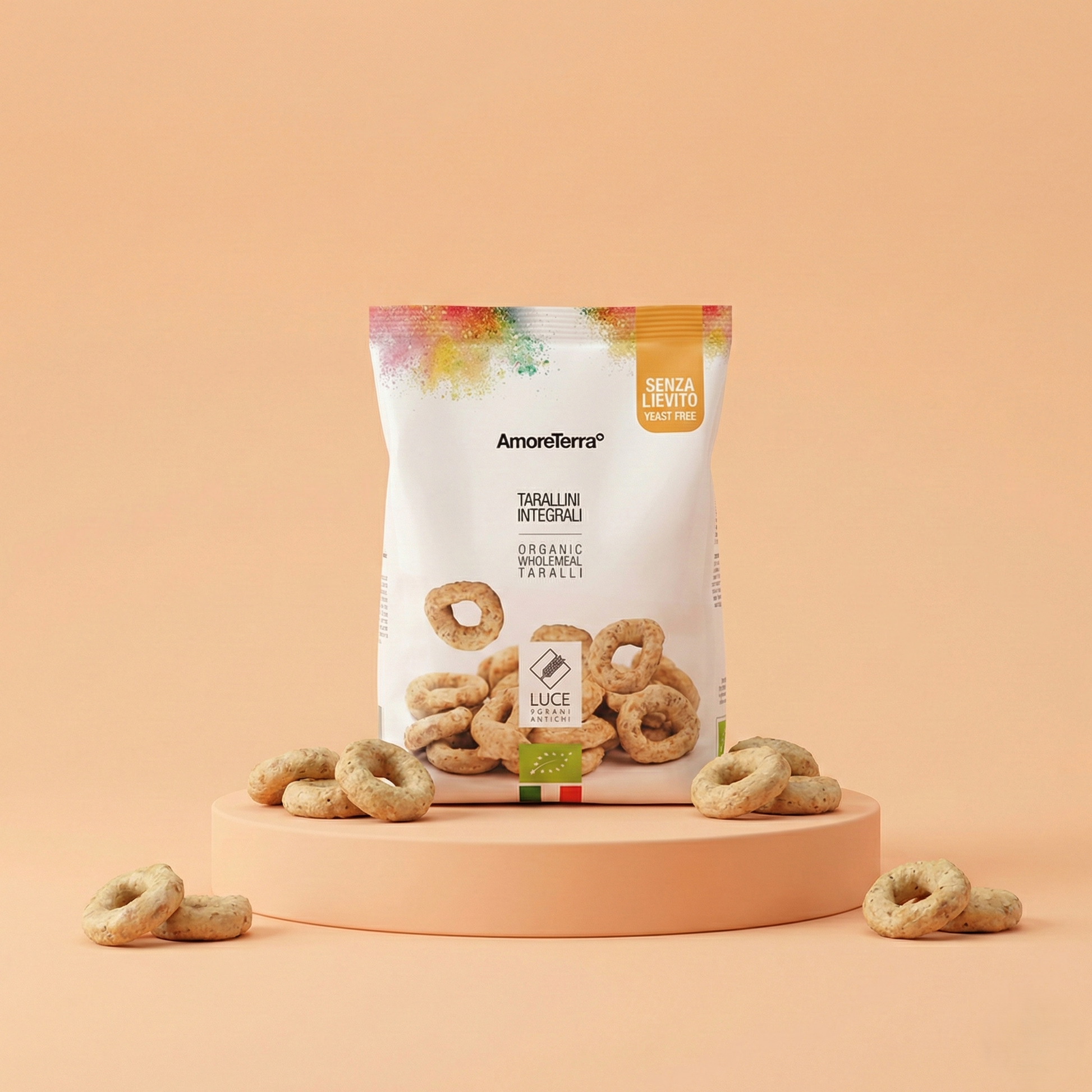 Taralli artigianali realizzati con Farina Luce (Gentil Rosso, Mentana, Verna, Marzuolo, Autonomia, Inallettabile, Terminillo, Risciola e grano del miracolo), farina sviluppata coltivando 9 grani antichi sullo stesso campo.