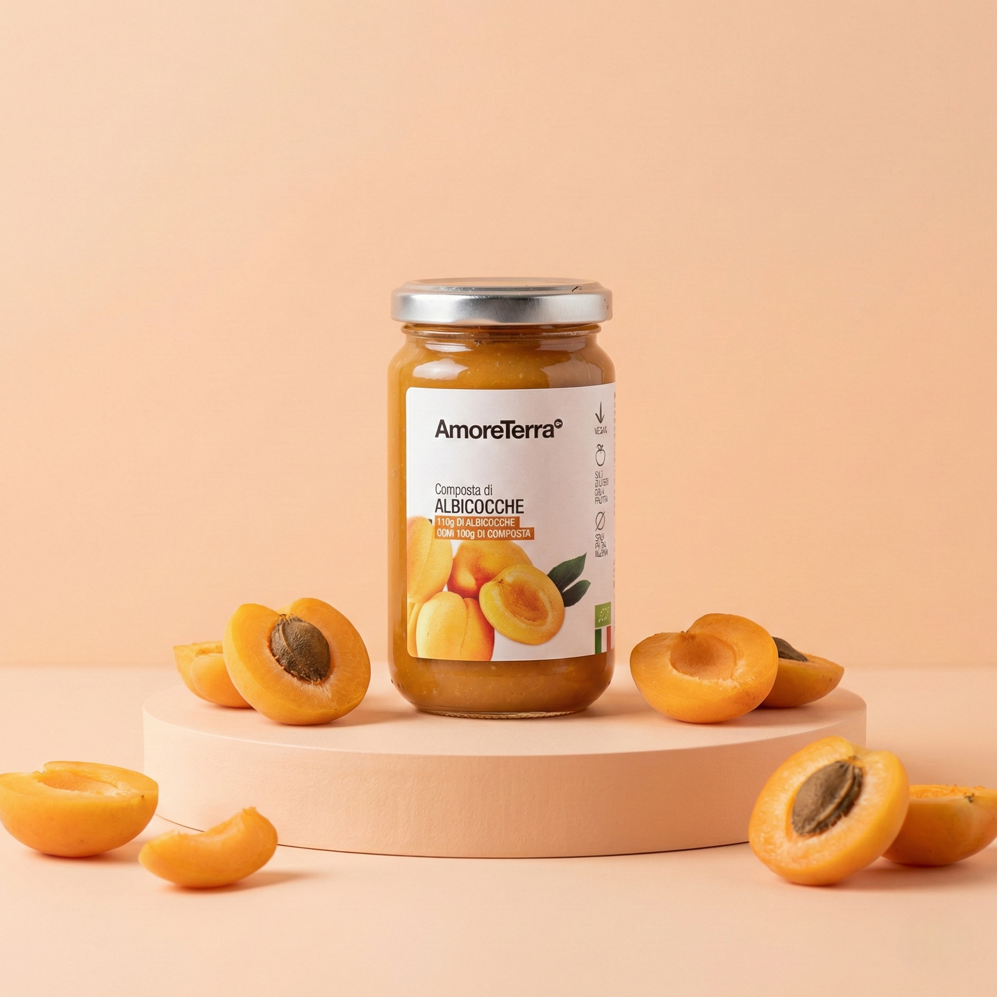 È realizzato con 2 soli ingredienti: albicocche e zucchero d'uva. Perché la natura non ha bisogno di zuccheri raffinati, né di pectina. Le albicocche vengono raccolte in stato avanzato di maturazione, quando contengono naturalmente più zuccheri, e il rapporto fra materia prima e composta è sempre a favore della prima: vengono utilizzati 110 g di albicocche ogni 100 g di composta.